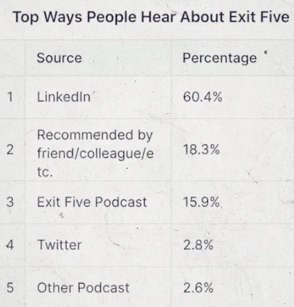 Exit Five's growth strategy centers on a simple but powerful principle: making existing members so happy that they naturally become advocates for the community [25]. That’s powered by a content flywheel, primarily on LinkedIn, which drives ~60% of signups [28]. The team maintains a strong presence on LinkedIn across multiple accounts with a combined following of ~300,000 [16]. This approach reflects Dave's belief that LinkedIn should be the primary 'PR' channel for any B2B startup [16].