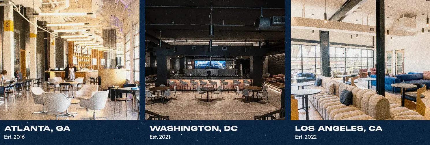 The Atlanta location spans 25,000 square feet, with similar footprints for the D.C. and Los Angeles clubs ⁶. These spaces are intentionally designed to accommodate "anything you would need to do in a modern day's worth of work" ⁶. For instance, each Gathering Spot has an events space, which they use to host everything from intimate dinners to large-scale conferences. The restaurant and bar areas provide complimentary meals and socializing opportunities, while the workspace areas include individual workstations, private offices, and conference rooms ³⁹.